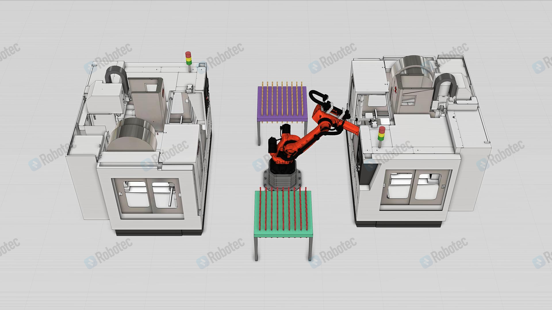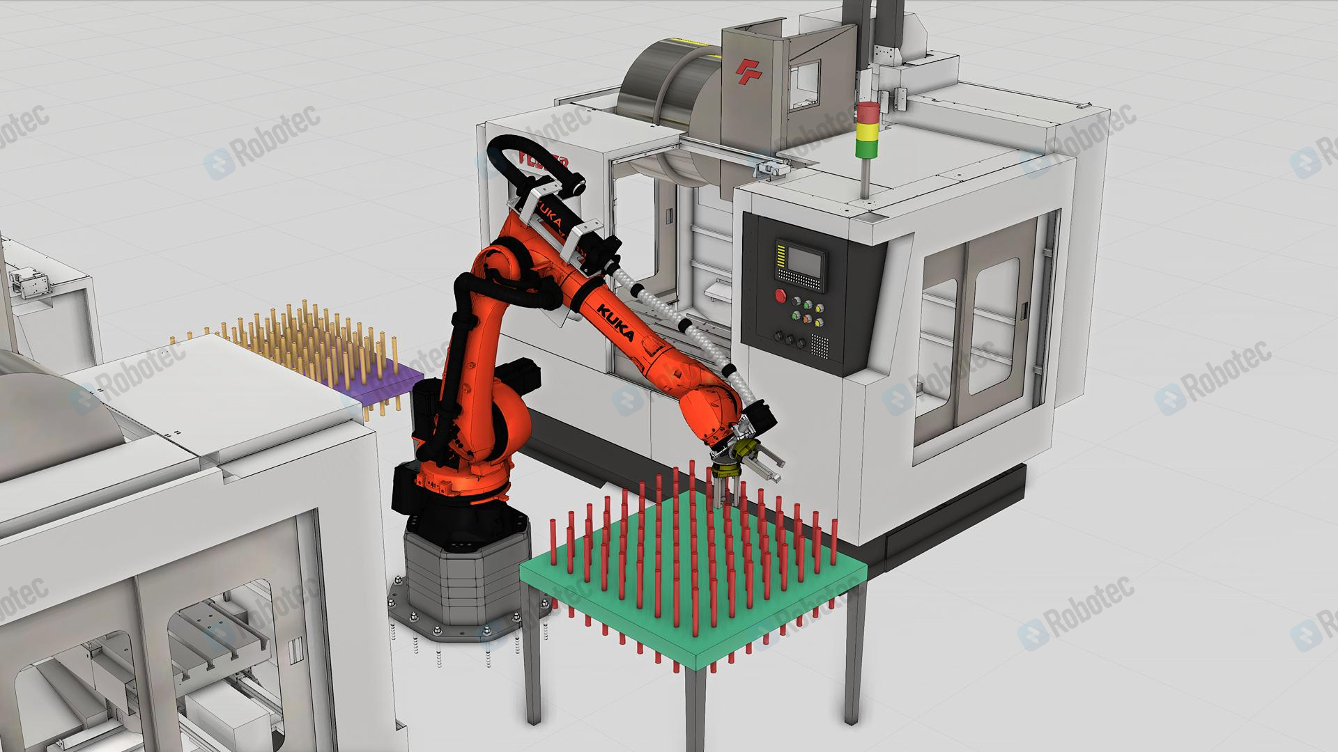 Для автоматизации обслуживания группы станков применен промышленный робот KUKA KR70 R2100. Характеристики манипулятора (досягаемость 2100 мм) позволяют обслуживать две единицы оборудования из одной точки, оптимизируя использование производственной площади.
