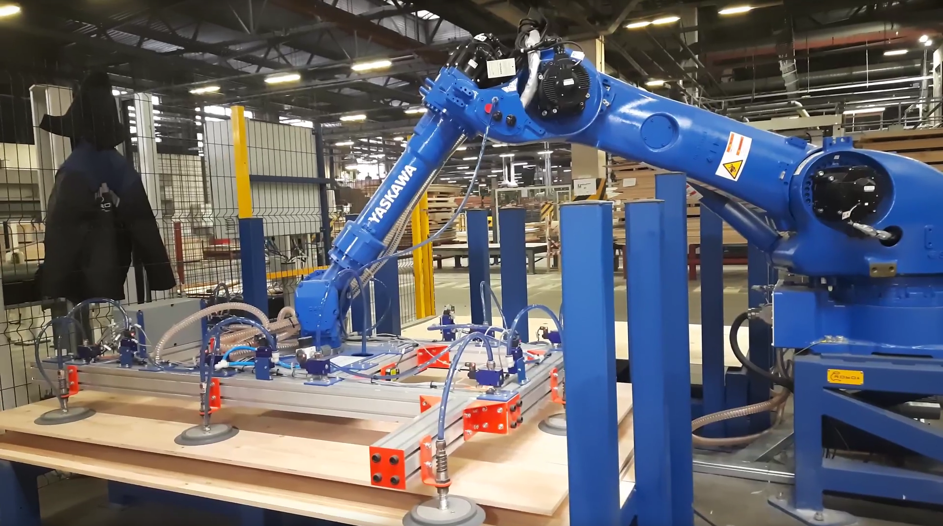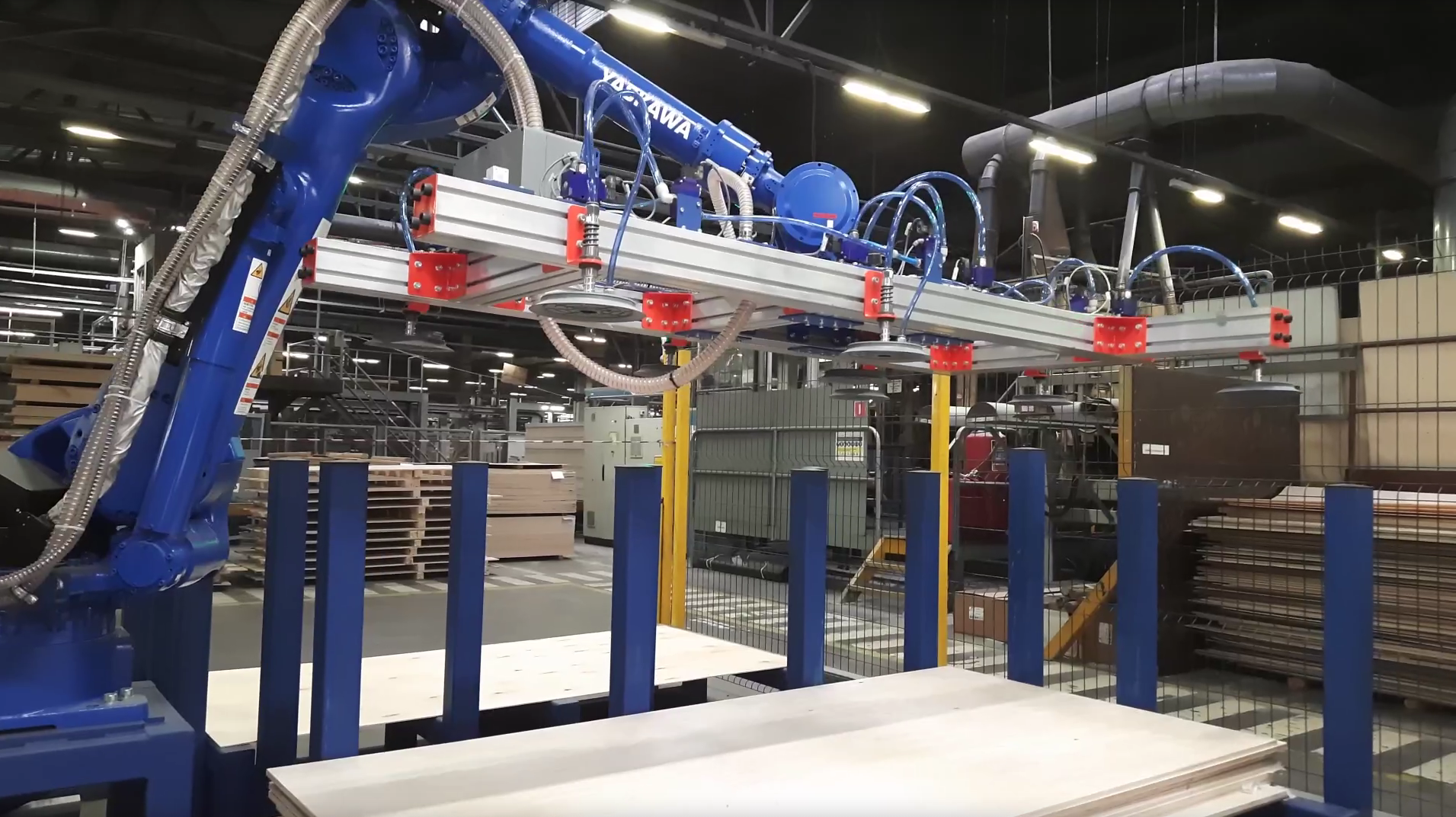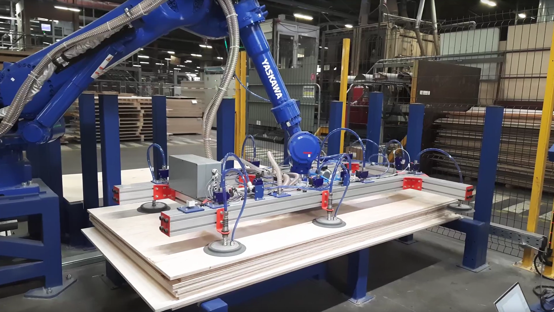 Автоматизация полностью исключила тяжёлые ручные операции с крупногабаритными грузами. Риск травм персонала и повреждения листов фанеры сведён к нулю — робот выполняет перемещение с постоянной точностью и контролируемым усилием.